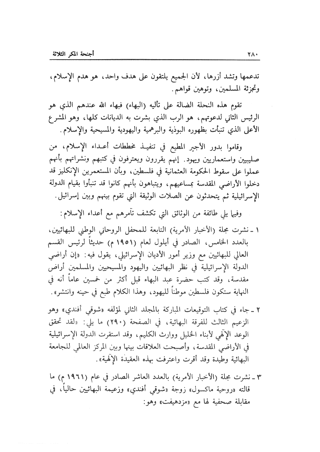 2- جاء في كتاب الوقيعات المباركة بالمجلد الثانية "شوقي أفندي" وهو الزعيم الثالث للفرقة البهائية، في الصفحة (290) ما يلي: "لقد تحقق الوعد الإلهي لأبناء الخليل ووارث الكليم، وقد استقرت الدولة الإسرائيلية في الأراضي المقدسة، وأصبحت العلاقات بينها وبين المركز العالمي للجامعة البهائية وطيدة وقد أقرت واعترفت بهذه العقيدة الإلهية".