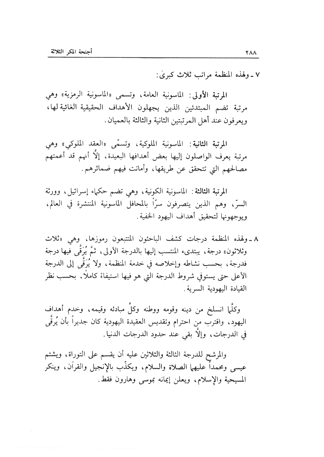 المرتبة الثالثة: الماسونية الكونية، وهي تضم حكماء إسرائيل، وورثة السرّ، وهم الذين يتصرفون سرّاً بالمحافل الماسونية المنتشرة في العالم، ويوجهونها لتحقيق أهداف اليهود الخفية.