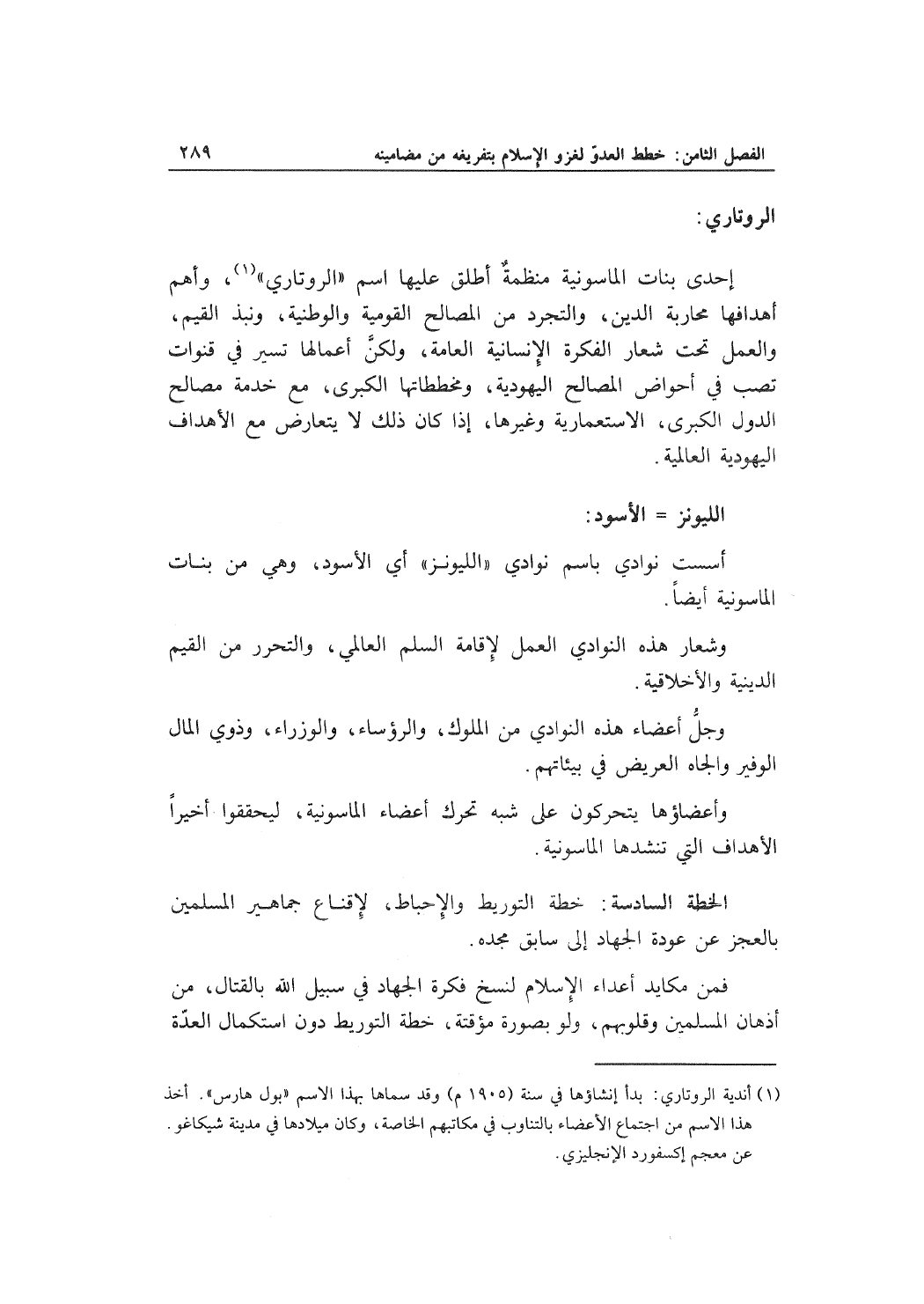 إحدى بنات الماسونية منظمةٌ أطلق عليها اسم "الروتاري"، وأهم أهدافهم محاربة الدين، والتجرد من المصالح القومية والوطنية، ونبذ القيم، والعمل تحت شعار الفكرة الإنسانية العامة، ولكنَّ أعمالها تسير في قنوات تصب في أحواض المصالح اليهودية، ومخططاتها الكبرى، مع خدمة مصالح الدول الكبرى، الاستعمارية وغيرها، إذا كان ذلك لا يتعارض مع الأهداف اليهودية العالمية.