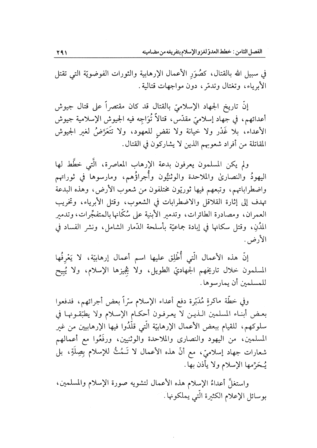 إنّ هذه الأعمال الّتي أُطْلِق عليها اسم أعمال إرهابيّة، لا يَعْرِفُها المسلمون خلال تاريخهم الجهاديّ الطويل، ولا يُجِيزها الإسلام، ولا يُبِيح للمسلمين أن يمارسوها.