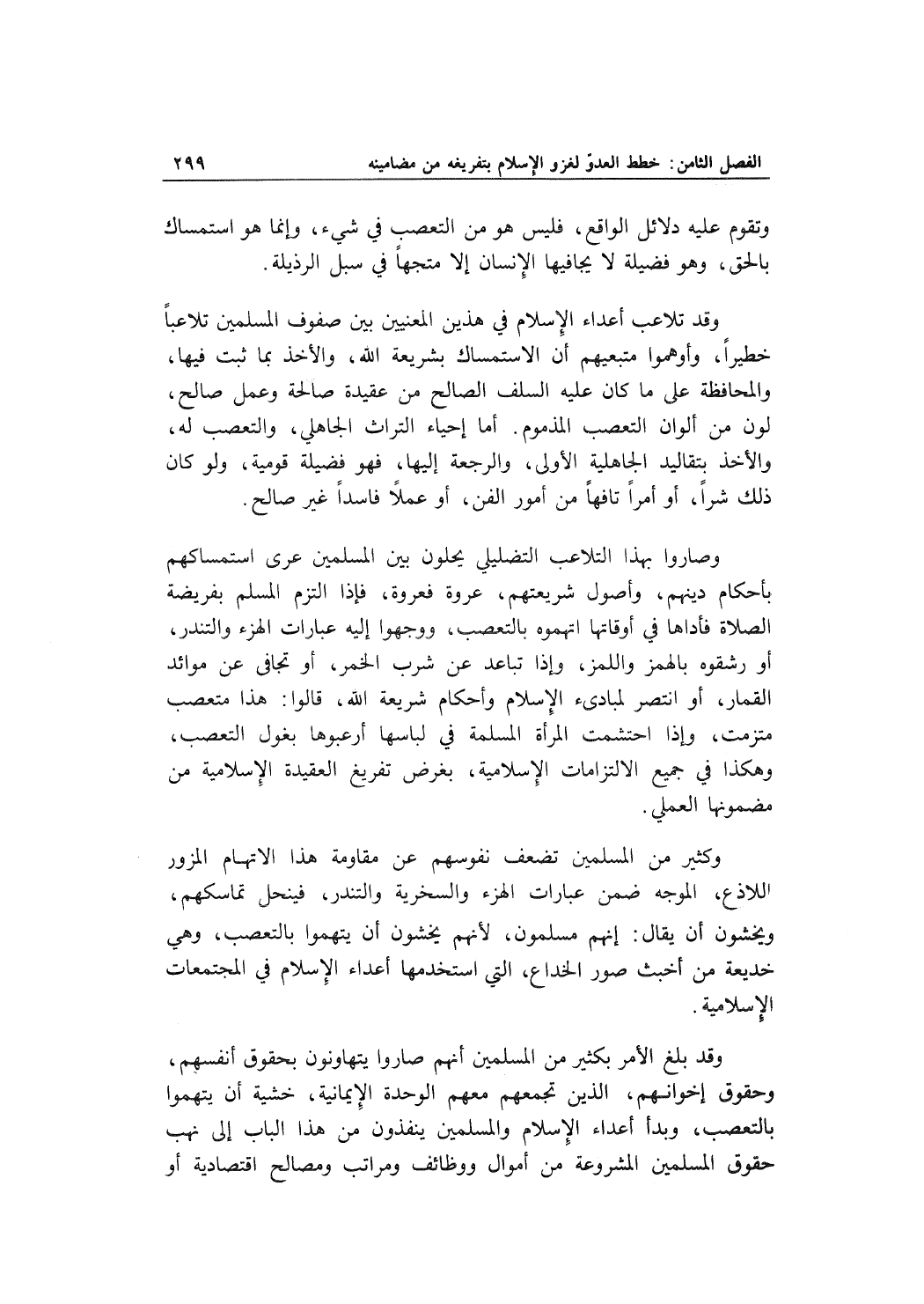 وقد بلغ الأمر بكثير من المسلمين أنهم صاروا يتهاونون بحقوق أنفسهم، وحقوق إخوانهم، الذين تجمعهم معهم الوحدة الإيمانية،خشية أن يتهموا بالتعصب، وبدأ أعداء الإسلام والمسلمين ينفذون من هذا الباب إلى نهب حقوق المسلمين المشروعة من أموال ووظائف ومراتب ومصالح اقتصادية