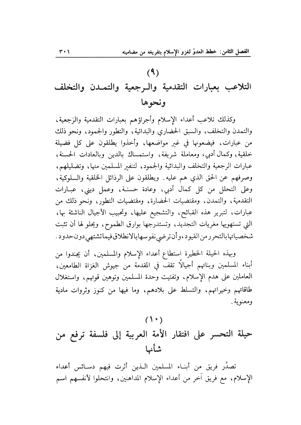 وكذلك تلاعب أعداء الإسلام وأجراؤهم بعبارات التقدمية والرجعية، والتمدن والتخلف، والسبق الحضاري والبدائية، والتطور الجمود، ونحو ذلك من عبارات، فيضعونها في غير مواضعها، أخذوا يطلقون على كل فضيلة خلقية، وكمال أدبي، ومعاملة شريفة، واستمساك بالدين وبالعادات الحسنة، عبارات الرجعية والتخلف والبدائية والجمود، لتنفير المسلمين منها، وتضليلهم، وصرفهم عن الحق الذي هم عليه. ويطلقون على الرذائل الخلقية والسلوكية، وعلى التحلل من كل كمال أدبي، وعادة حسنة، وعمل ديني، عبارات التقدمية، والتمدن، ومقتضيات الحضارة، ومقتضيات التطور، ونحو ذلك من عبارات، لتبرير هذه القبائح، والتشجيع عليها، وتحبيب الأجيال الناشئة بها، التي تستهويها مغربات التجديد، وتستدرجها بوارق الطموح، ويحلو لها أن تثبت شخصياتها بالتحرر من القيود، وأن ترضي نفوسها بالانطلاق فيما تشتهي دون حدود.