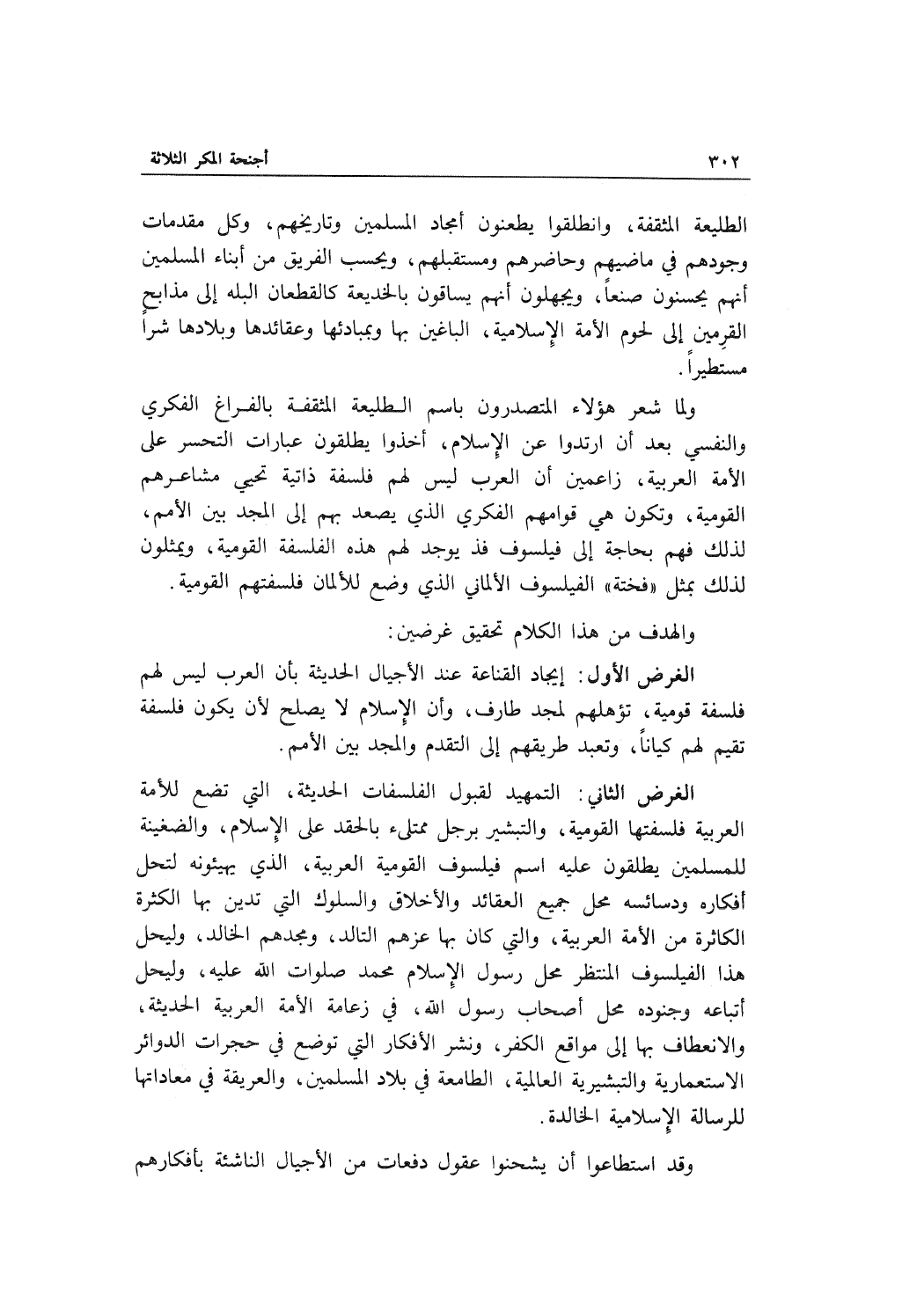 الغرض الثاني: التمهيد لقبول الفلسفات الحديثة، التي تضع للأمة العربية فلسفتها القومية، والتبشير برجل ممتلئ بالحقد على الإسلام، والضغينة للمسلمين يطلقون عليه اسم فيلسوف القومية العربية، الذي يهيئونه لتحل أفكاره ودسائسه محل جميع العقائد والأخلاق والسلوك التي تدين بها الكثرة الكاثرة من الأمة العربية، والتي كان بها عزهم التالد، ومجدهم الخالد، وليحل هذا الفيلسوف المنتظر محل رسول الإسلام محمد صلوات الله عليه، وليحل أتباعه وجنوده محل أصحاب رسول الله، في زعامة الأمة العربية الحديثة، والانعطاف بها إلى مواقع الكفر، ونشر الأفكار التي توضع في حجرات الدوائر الاستعمارية والتبشيرية العالمية، الطامعة في بلاد المسلمين، والعريقة في معاداتها للرسالة الإسلامية الخالدة.