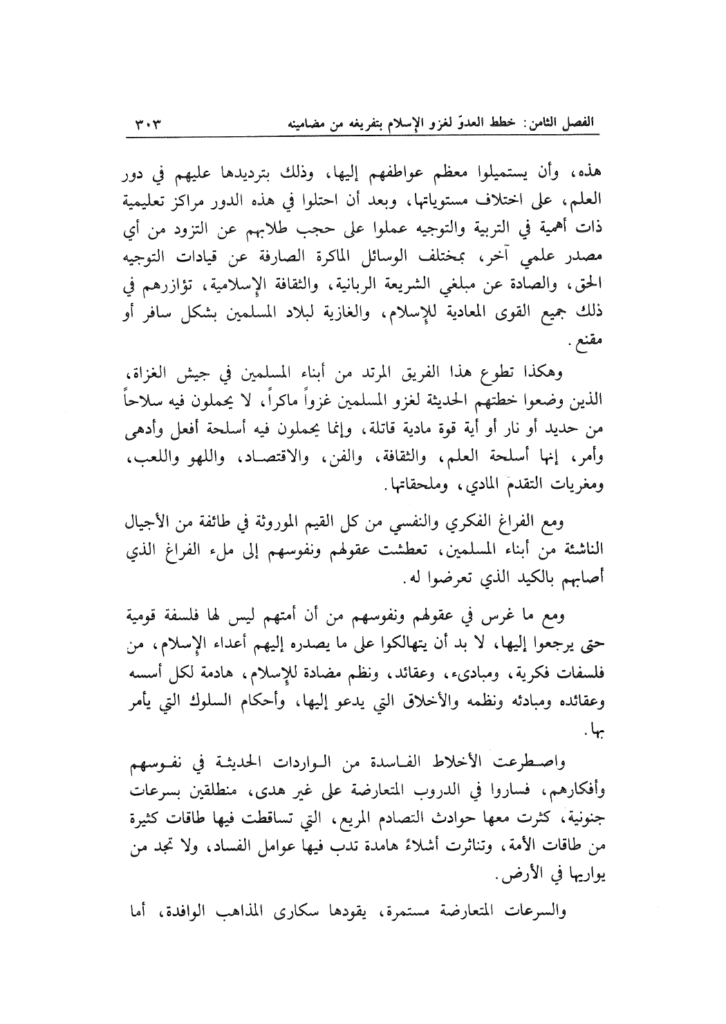 هذه، وأن يستميلوا معظم عواطفهم إليها، وذلك بترديدها عليهم في دور العلم، على اختلاف مستوياتها، وبعد أن احتلوا في هذه الدور مراكز تعليمية ذات أهمية في التربية والتوجيه عملوا على حجب طلابهم عن التزود من أي مصدر علمي آخر، بمختلف الوسائل الما كرة الصارفة عن قيادات التوجيه الحق، والصادة عن مبلغي الشريعة الربانية، والثقافة الإسلامية، تؤازرهم في ذلك جميع القوى المعادية للإسلام، والغازية لبلاد المسلمين بشكل سافر أو مقنع.