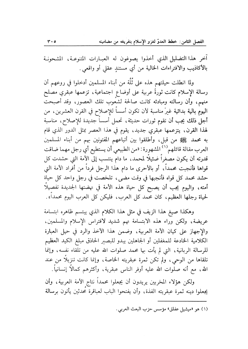 ولما انطلت حيلتهم هذه على ثُلَّة من أبناء المسلمين أدخلوا في روعهم أن رسالة الإسلام كانت ثورةً عربية على أوضاعٍ اجتماعية، تزعمها عبقري مصلح منهم، وأن رسالته ومبادئه كانت صالحة لشعوب تلك العصور، وقد أصبحت اليوم بالية بدائية غير مناسبة لأن تكون أسساً للإصلاح في القرن العشرين، من أجل ذلك يجب أن تقوم ثورات حديثة، تحمل أسساً جديدة للإصلاح، مناسبة لهذا القرن، يتزعمها عبقري جديد، يقوم في هذا العصر بمثل الدور الذي قام به محمد من قبل، وأطلقوا بين أتباعهم المفتونين بهم من أبناء المسلمين العرب مقالة قائلهم المشهورة: "من الطبيعي أن يستطيع أي رجل مهما ضاقت قدرته أن يكون مصغراً ضئيلاً لمحمد، ما دام ينتسب إلى الأمة التي حشدت كل قواها فأنجبت محمداً، أو بالأحرى ما دام هذا الرجل فرداً من أفراد الأمة التي حشد محمد كل قواه فأنجبها في وقت مضى، تلخصت في رجل واحد كل حياة أمته، واليوم يجب أن يصبح كل حياة هذه الأمة في نهضتها الجديدة تفصيلاً لحياة رجلها العظيم، كان محمد كل العرب، فليكن كل العرب اليوم محمداً".