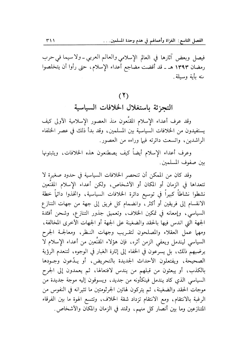 وقد كان من الممكن أن تنحصر الخلافات السياسية في حدود صغيرة لا تتعداها في الزمان أو المكان أو الأشخاص , ولكن أعداء الإسلام المقنعين نشطوا نشاطاً كبيراً في توسيع دائرة الخلافات السياسية , واتخذوا دائماً خطة الانقسام إلى فريقين أو أكثر , وانضمام كل فريق إلى جهة من جهات التنازع السياسي , وإمعانه في تمكين الخلاف , وتعميق جذور التنازع , وشحن أفئدة الجهة التي اندس فيها بالحقد والضغينة على الجهة أو الجهات الأخرى المخالفة , ومهما عمل العقلاء والمصلحون لتقريب وجهات النظر , ومعالجة الجرح السياسي ليندمل ويعفي الزمن أثره , فإن هؤلاء المقنعين من أعداء الإسلام لا يرضيهم ذلك , بل يسرعون في الخفاء إلى إثارة الغبار في الوجوه , لتنعدم الرؤية الصحيحة , ويفتعلون الأحداث الجديدة بالتحريض , أو يدعون وجودها بالكذب , أو يبعثون من قبلهم من يندس لافتعالها , ثم يعمدون إلى الجرح السياسي الذي كاد يندمل فينكأونه من جديد , ويسوقون إليه موجة جديدة من موجات الحقد والضغينة , ثم يتركون لهاتين الجرثومتين ما تثيرانه في النفوس من الرغبة بالانتقام , ومع الانتقام تزداد شقة الخلاف , وتتسع الهوة ما بين الفرقاء المتنازعين وما بين أنصار كل منهم , وتمتد في الزمان والمكان والأشخاص.