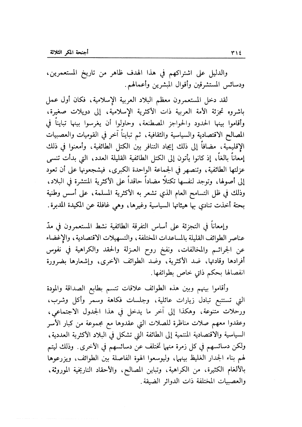 وأقاموا بينهم وبين هذه الطوائف علاقات تتسم بطابع الصداقة والمودة التي تستتبع تبادل زيارات عائلية , وجلسات فكاهة وسمر وأكل وشرب , ورحلات متنوعة , وهكذا إلى آخر ما يدخل في هذا الجدول الاجتماعي , وعقدوا معهم صلات مناظرة للصلات التي عقدوها مع مجموعة من كبار الأسر السياسية والاقتصادية المنتمية إلى الطائفة التي تشكل في البلاد الأكثرية العددية , ولكن دسائسهم في كل زمرة منها تختلف عن دسائسهم في الأخرى. وذلك ليتم لهم بناء الجدار الغليظ بينهما , وليوسعوا الهوة الفاصلة بين الطوائف , ويزرعوها بالألغام الكثيرة , من الكراهية , وتباين المصالح , والأحقاد التاريخية الموروثة , والعصبيات المختلفة ذات الدوائر الضيقة.