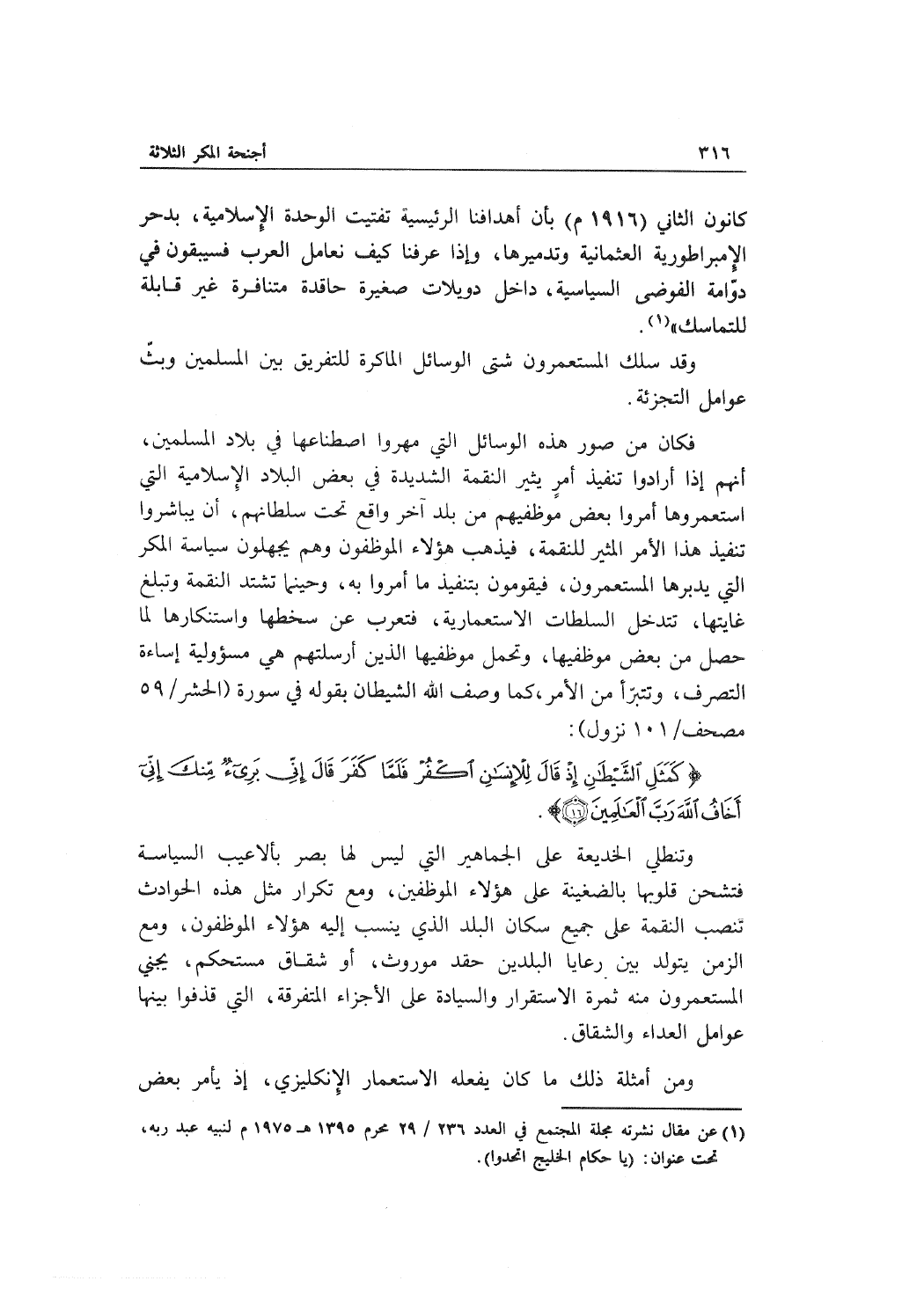 فكان من صور هذه الوسائل التي مهروا اصطناعها في بلاد المسلمين , أنهم إذا أرادوا تنفيذ أمرٍ يثير النقمة الشديدة في بعض البلاد الإسلامية التي استعمروها أمروا بعض موظفيهم من بلد آخر واقع تحت سلطانهم , أن يباشروا تنفيذ هذا الأمر المثير للنقمة , فيذهب هؤلاء الموظفون وهم يجهلون سياسة المكر التي يدبرها المستعمرن , فيقومون بتنفيذ ما أمروا به , وحينما تشتد النقمة وتبلغ غايتها , تتدخل السلطات الاستعمارية , فتعرب عن سخطها واستنكارها لما حصل من بعض موظفيها , وتحمل موظفيها الذين أرسلتهم هي مسؤولية إساءة التصرف , وتتبرّأ من الأمر , كما وصف الله الشيطان بقوله في سورة (الحشر / 59 مصحف / 101 نزول) :