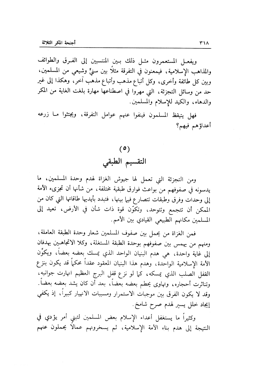 فمن الغزاة من يحمل بين صفوف المسلمين شعار وحدة الطبقة العاملة , ومنهم من يهمس بين صفوفهم بوحدة الطبقة المستغلة , وكلا الاتجاهين يهدفان إلى غاية واحدة , هي هدم البنيان الواحد الذي يمسك بعضه بعضاً , ويكوِّن الأمة الإسلامية الواحدة , وهدم هذا البنيان المعقود عقداً محكماً قد يكون بنزع القفل الصلب الذي يمسكه , كما لو نزع قفل البرج العظيم انهارت جوانبه , وتناثرت أحجاره , وتهاوى يحطم بعضه بعضاً , بعد أن كان يشد بعضه بعضاً. وقد لا يكون الفرق بين موجبات الاستمرار ومسببات الانهيار كبيراً , إذ يكفي إيجاد خلل يسير لهدم صرح شامخ.
