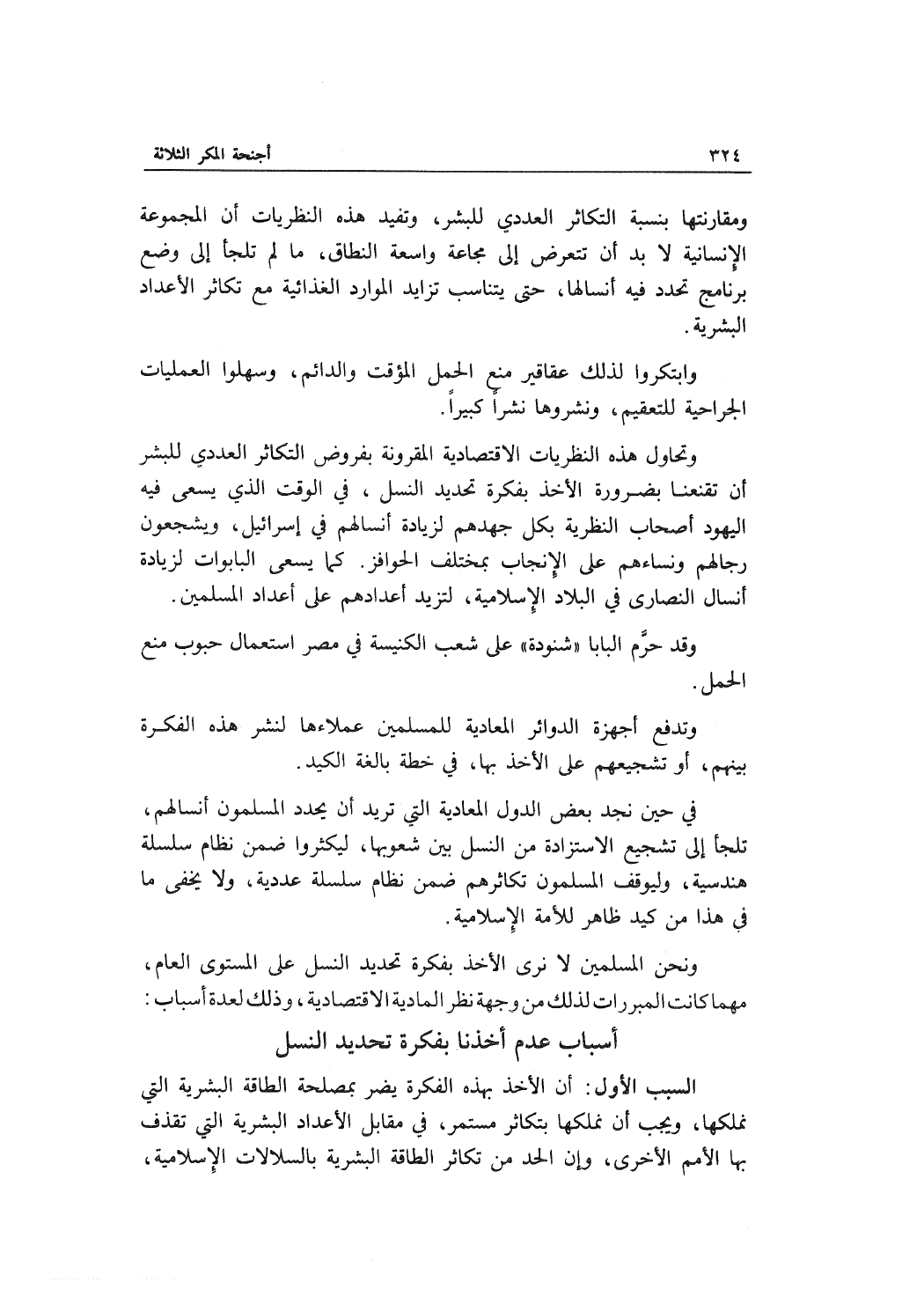 السبب الأول: أن الأخذ بهذه الفكرة يضر بمصلحة الطاقة البشرية التي نملكها , ويجب أن نملكها بتكاثر مستمر , في مقابل الأعداد البشرية التي تقذف بها الأمم الأخرى , وإن الحد من تكاثر الطاقة البشرية بالسلالات الإسلامية ,
