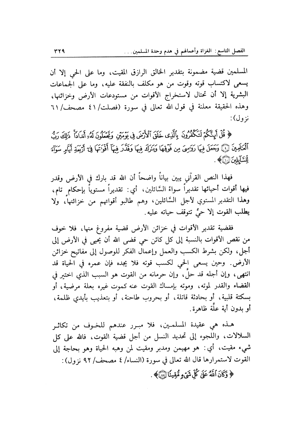 المسلمين قضية مضمونة بتقدير الخالق الرازق المقيت , وما على الحي إلا أن يسعى لاكتساب قوته وقوت من هو مكلف بالنفقة عليه , وما على الجماعات البشرية إلا أن تحتال لاستخراج الأقوات من مستودعات الأرض وخزائنها , وهذه الحقيقة معلنة في قول الله تعالى في سورة (فصلت / 41 مصحف / 61 نزول) :