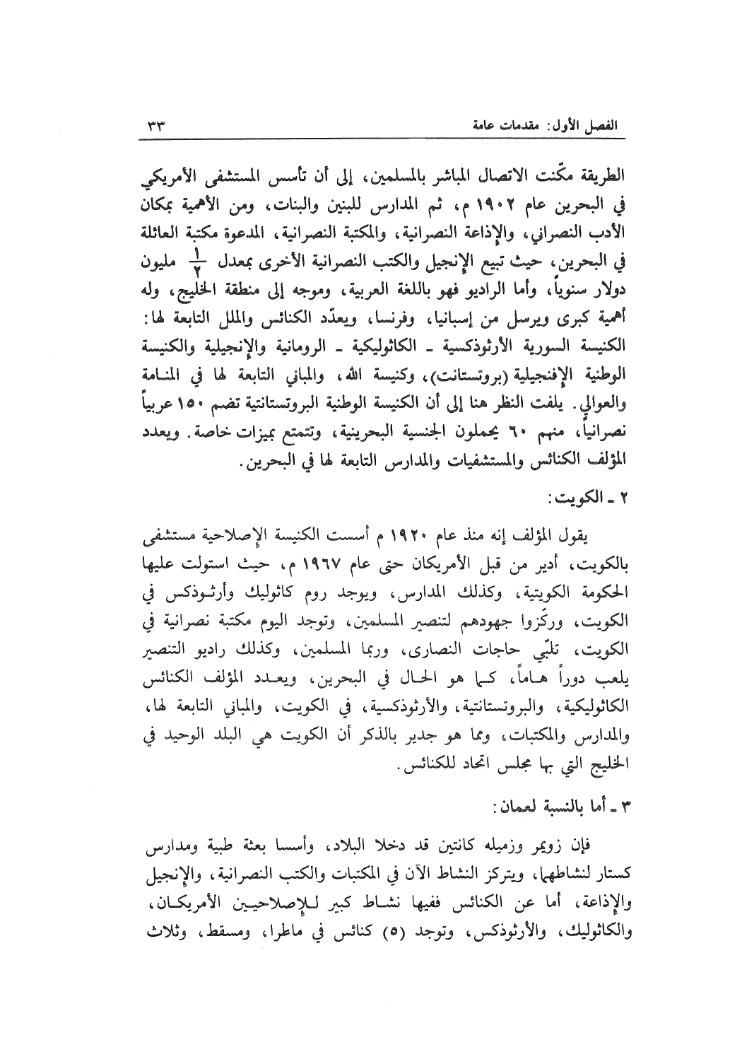يقول المؤلف إنه منذ عام 1920 م أسست الكنيسة الإصلاحية مستشفى بالكويت، أدير من قبل الأمريكان حتى عام 1967م، حيث استولت عليها الحكومة الكويتية وكذلك المدارس ويوجد روم كاثوليك وأرثوذكس في الكويت، وركّزوا جهودهم لتنصير المسلمين، وتوجد اليوم مكتبة نصرانية في الكويت، تلبي حاجات النصارى وربما المسلمين وكذلك راديو التنصير يلعب دوراً هاماً كما هو الحال في البحرين. ويعدد المؤلف الكنائس الكاثوليكية والبروتستانتية والأرثوذكسية في الكويت والمباني التابعة لها والمدارس والمكتبات ومما هو جدير بالذكر أن الكويت هي البلد الوحدي في الخليج التي بها مجلس اتحاد للكنائس.