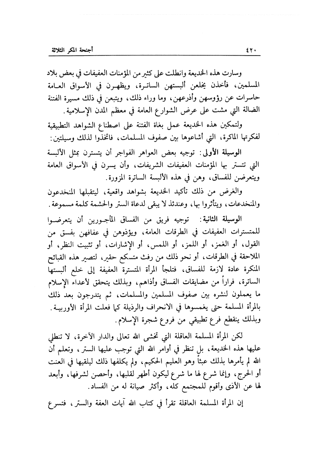 الوسيلة الأولى: توجيه بعض العواهر الفواجر أن يتسترن بمثل الألبسة التي تتستر بها المؤمنات العفيفات الشريفات , وأن يسرن في الأسواق العامة ويتعرضن للفساق , وهن في هذه الألبسة الساترة المزورة.