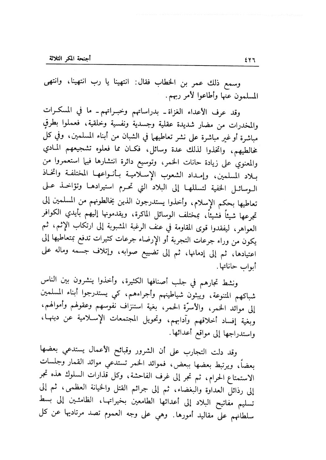 ونشط تجارهم في جلب أصنافها الكثيرة، وأخذوا ينشرون بين الناس شباكهم المتنوعة، ويبثون شياطينهم وأجراءهم، كي يستدرجوا أبناء المسلمين إلى موائد الخمر، والأسرّة الحمر، بغية استنزاف نفوسهم وعقولهم وأموالهم، وبغية إفساد أخلاقهم وآدابهم، وتحويل المجتمعات الإسلامية عن دينها، واستدراجها إلى مواقع أعدائها.