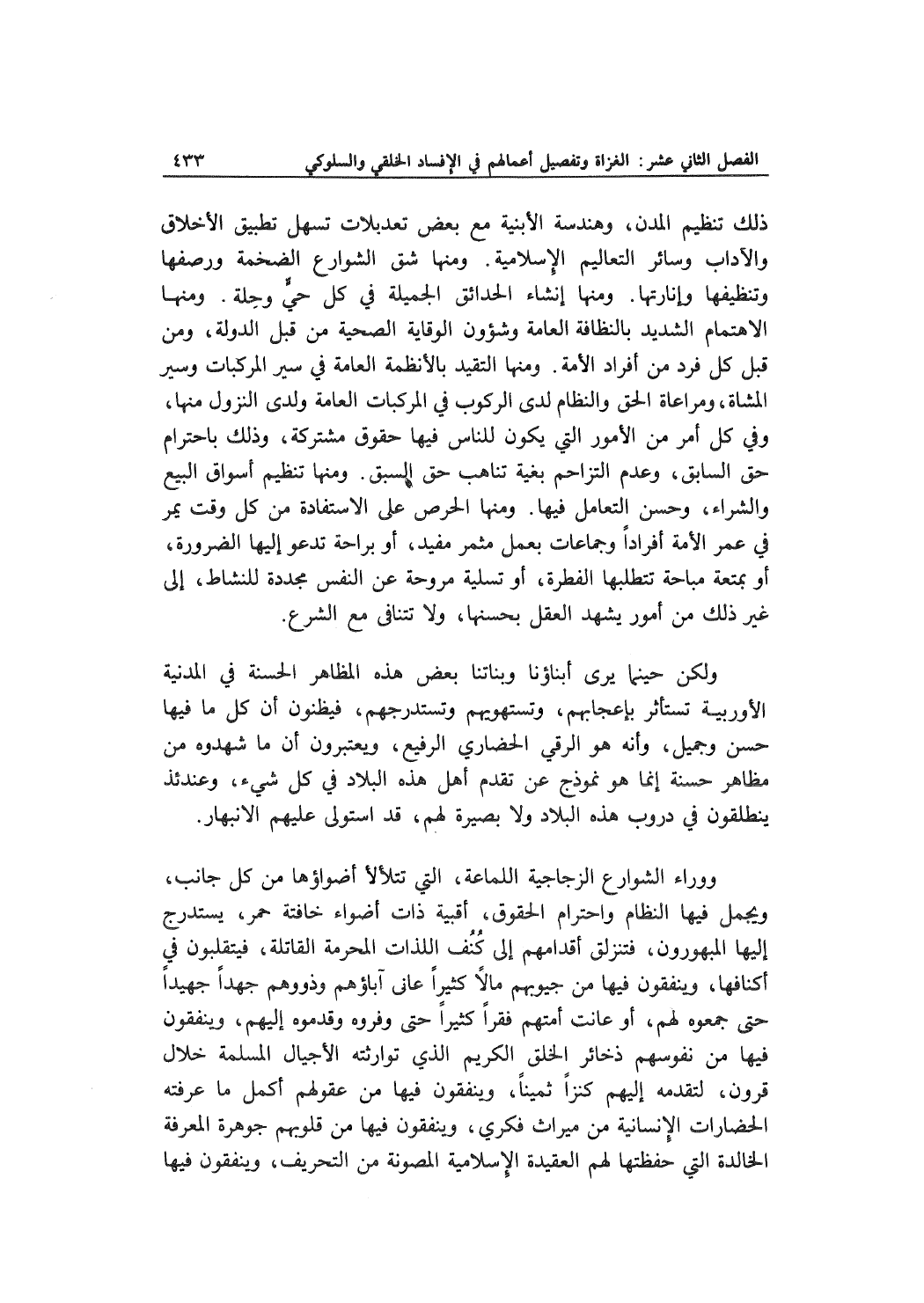 ووراء الشوارع الزجاجية اللماعة، التي تتلألأ أضواؤها من كل جانب، ويجمل فيها النظام واحترام الحقوق، أقبية ذات أضواء خافتة حمر، يستدرج إليها المبهورون، فتنزلق أقدامهم إلى كُنُف اللذات المحرمة القاتلة، فيتقلبون في أكنافها، وينفقون فيها من جيوبهم مالاً كثيراً عانى آباؤهم وذووهم جهداً جهيداً حتى جمعوه لهم، أو عانت أمتهم فقراً كثيراً حتى وفروه وقدموه إليهم، وينفقون فيها من نفوسهم ذخائر الخلق الكريم الذي توارثته الأجيال المسلمة خلال قرون، لتقدمه إليهم كنزاً ثميناً، وينفقون فيها من عقولهم أكمل ما عرفته الحضارات الإنسانية من ميراث فكري، وينفقون فيها من قلوبهم جوهرة المعرفة الخالدة التي حفظتها لهم العقيدة الإسلامية المصونة من التحريف، وينفقون فيها