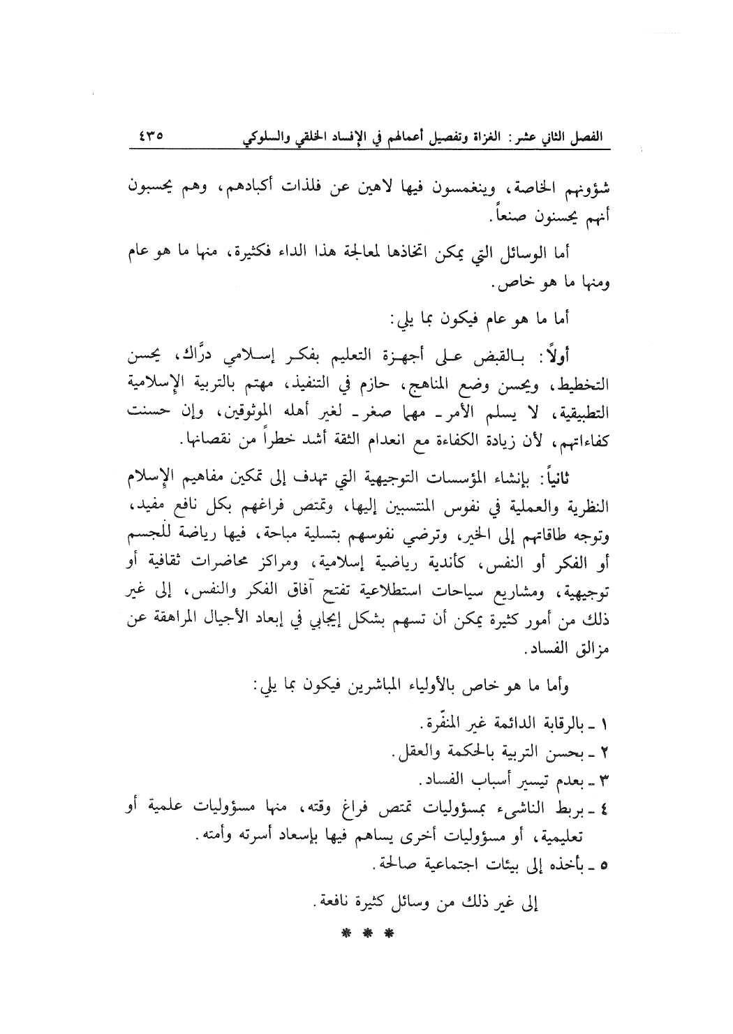أولاً: بالقبض على أجهزة التعليم بفكر إسلامي درَّاك، يحسن التخطيط، ويحسن وضع المناهج، حازم في التنفيذ، مهتم بالتربية الإسلامية التطبيقية، لا يسلم الأمر - مهما صغر - لغير أهله الموثوقين، وإن حسنت كفاءاتهم، لأن زيادة الكفاءة مع انعدام الثقة أشد خطراً من نقصانها.