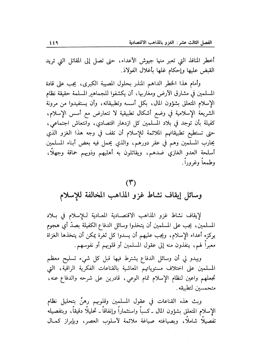لإيقاف نشاط غزو المذاهب الاقتصادية المعادية للإسلام في بلاد المسلمين، يجب على المسلمين أن يتخذوا وسائل الدفاع الكفيلة بصدّ أي هجوم يركزه أعداء الإسلام، ويجب عليهم أن يسدوا كل ثغرة يمكن أن يتخذها الغزاة معبراً لهم، ينفذون منه إلى عقول المسلمين أو قلوبهم أو نفوسهم.
