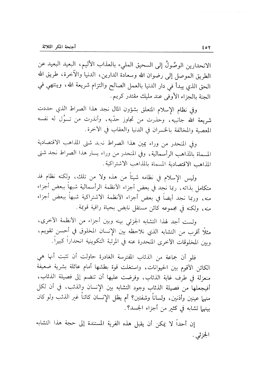 وليس الإسلام في نظامه شيئاً من هذه ولا من تلك، ولكنه نظام فذ متكامل بذاته، ربما نجد في بعض أجزاء الأنظمة الرأسمالية شبهاً ببعض أجزاء منه، وربما نجد أيضاً في بعض أجزاء الأنظمة الاشتراكية شبهاً ببعض أجزاء منه، ولكنه في مجموعة كائن مستقل نابض بحياة راقية قويمة.