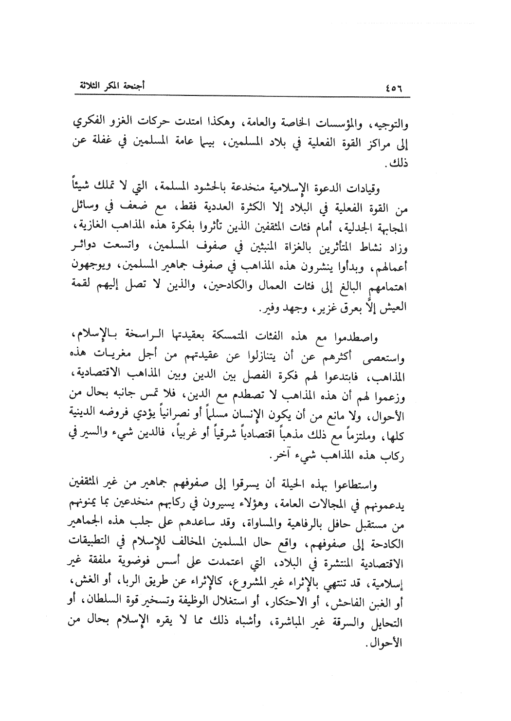 وقيادات الدعوة الإسلامية منخدعة بالحشود المسلمة، التي لا تملك شيئاً من القوة الفعلية في البلاد إلا الكثرة العددية فقط، مع ضعف في وسائل المجابهة الجدلية، أمام فئات المثقفين الذين تأثروا بفكرة هذه المذاهب الغازية، وزاد نشاط المتأثرين بالغزاة المنبثين في صفوف المسلمين، واتسعت دوائر أعمالهم، وبدأوا ينشرون هذه المذاهب في صفوف جماهير المسلمين، ويوجهون اهتمامهم البالغ إلى فئات العمال والكادحين، والذين لا تصل إليهم لقمة العيش إلاَّ بعرق غزير، وجهد وفير.
