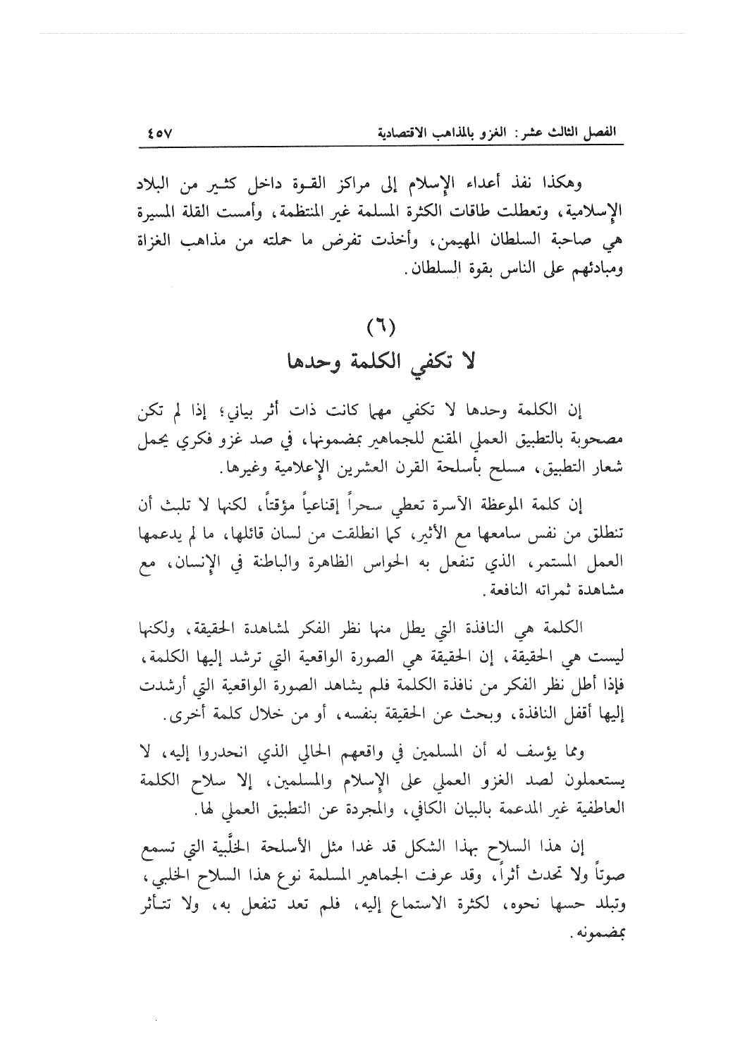 إن الكلمة وحدها لا تكفي مهما كانت ذات أثر بياني؛ إذا لم تكن مصحوبة بالتطبيق العملي المقنع للجماهير بمضمونها، في صد غزو فكري يحمل شعار التطبيق، مسلح بأسلحة القرن العشرين الإعلامية وغيرها.