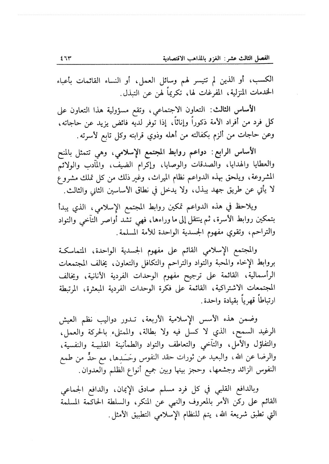 الأساس الثالث: التعاون الاجتماعي، وتقع مسؤولية هذا التعاون على كل فرد من أفراد الأمة ذكوراً وإناثاً، إذا توفر لديه فائض يزيد عن حاجاته، وعن حاجات من ألزم بكفالته من أهله وذوي قرابته وكل تابع لأسرته.