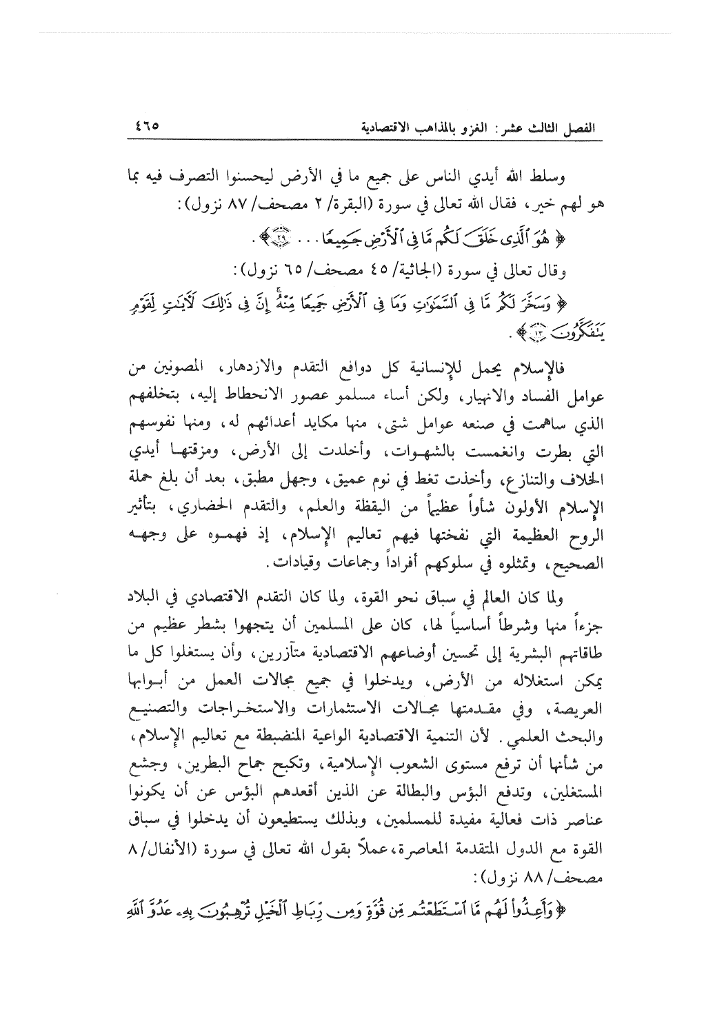 ولما كان العالم في سباق نحو القوة، ولما كان التقدم الاقتصادي في البلاد جزءاً منها وشرطاً أساسياً لها، كان على المسلمين أن يتجهوا بشطر عظيم من طاقاتهم البشرية إلى تحسين أوضاعهم الاقتصادية متآزرين، وأن يستغلوا كل ما يمكن استغلاله من الأرض، ويدخلوا في جميع مجالات العمل من أبوابها العريصة، وفي مقدمتها مجالات الاستثمارات والاستخراجات والتصنيع والبحث العلمي. لأن التنمية الاقتصادية الواعية المنضبطة مع تعاليم الإسلام، من شأنها أن ترفع مستوى الشعوب الإسلامية، وتكبح جماح البطرين، وجشع المستغلين، وتدفع البؤس والبطالة عن الذين أقعدهم البؤس عن أن يكونوا عناصر ذات فعالية مفيدة للمسلمين، وبذلك يستطيعون أن يدخلوا في سباق القوة مع الدول المتقدمة المعاصرة، عملاً بقول الله تعالى في سورة (الأنفال/8 مصحف/88 نزول) :