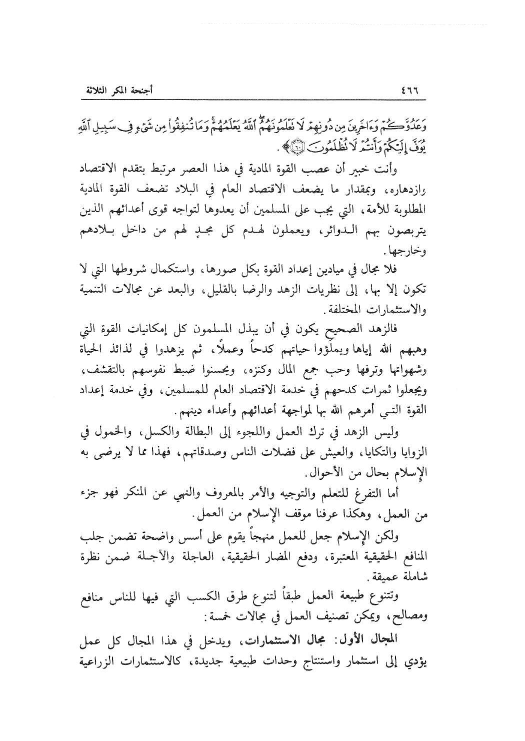فلا مجال في ميادين إعداد القوة بكل صورها، واستكمال شروطها التي لا تكون إلا بها، إلى نظريات الزهد والرضا بالقليل، والبعد عن مجالات التنمية والاستثمارات المختلفة.
