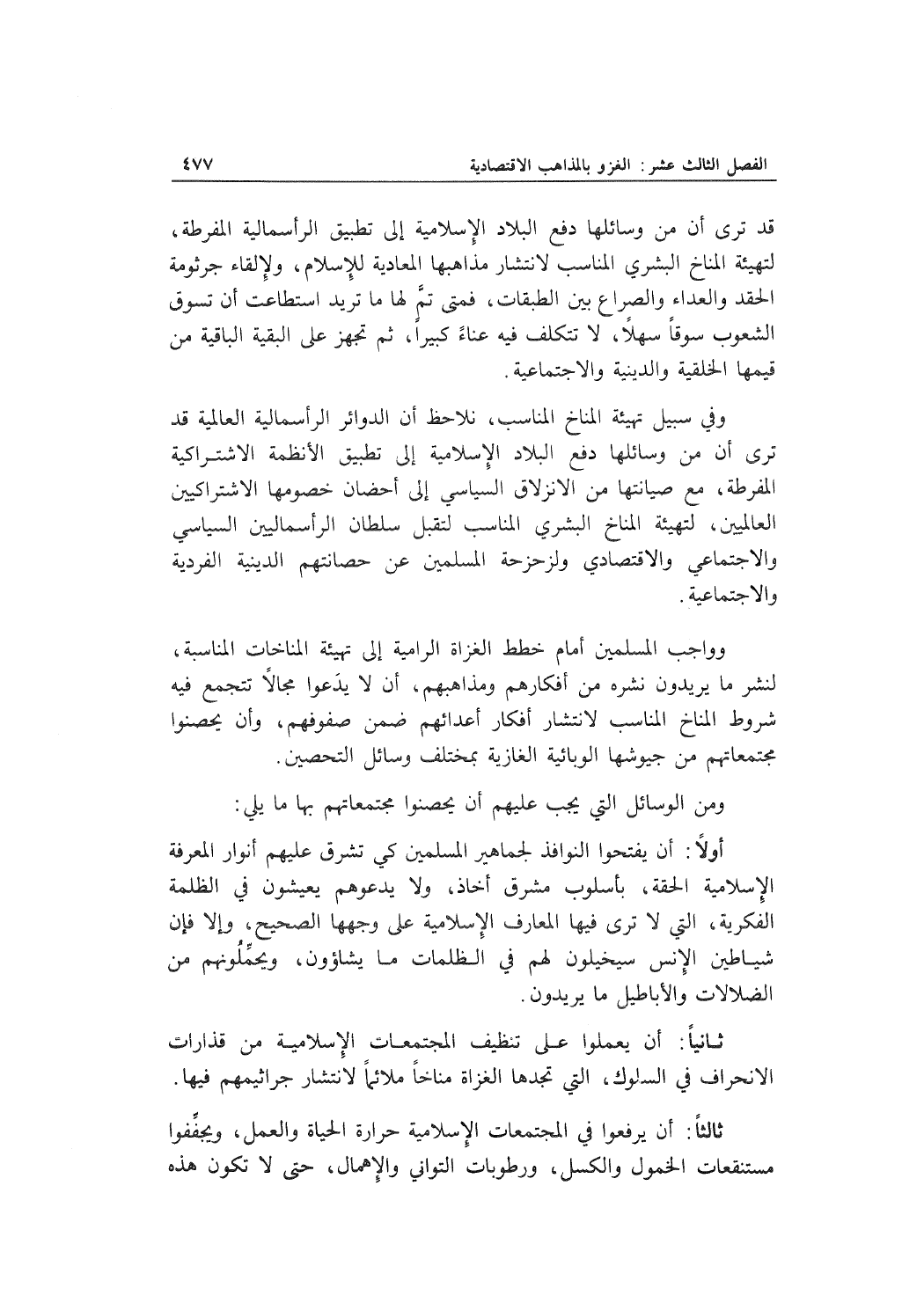 قد ترى أن من وسائلها دفع البلاد الإسلامية إلى تطبيق الرأسمالية المفرطة، لتهيئة المناخ البشري المناسب لانتشار مذاهبها المعادية للإسلام، ولإلقاء جرثومة الحقد والعداء والصراع بين الطبقات، فمتى تمَّ له ما تريد استطاعت أن تسوق الشعوب سوقاً سهلاً، لا تتكلف فيه عناءً كبيراً، ثم تجهز على البقية الباقية من قيمها الخلقية والدينية والاجتماعية.