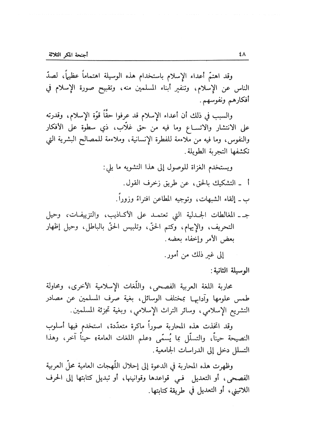 محاربة اللغة العربية الفصحى واللغات الإسلامية الأخرى ومحاولة طمس علومها وآدابها بمختلف الوسائل بغية صرف المسلمين عن مصادر التشريع الإسلامي وسائر التراث الإسلامي وبغية تجزئة المسلمين.