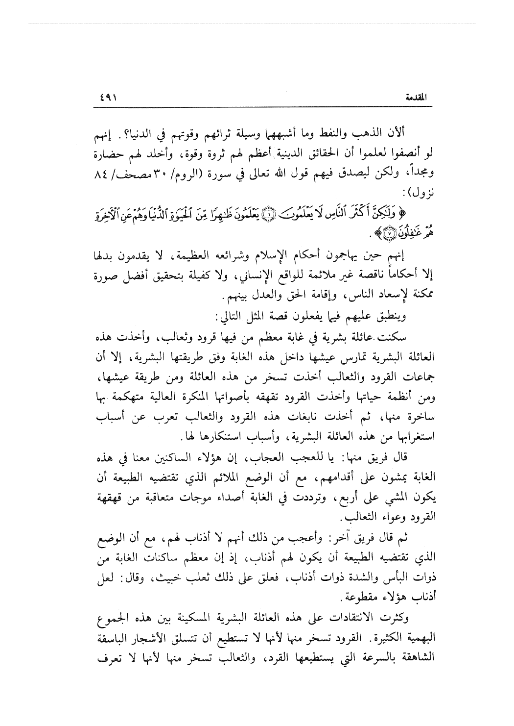 قال فريق منها: ياللعجب العجاب، إن هؤلاء الساكنين معنا في هذه الغابة يمشون على أقدامهم، مع أن الوضع الملائم الذي تقتضيه الطبيعة أن يكون المشي على أربع، وترددت في الغابة أصداء موجات متعاقبة من قهقهة القرود وعواء الثعالب.