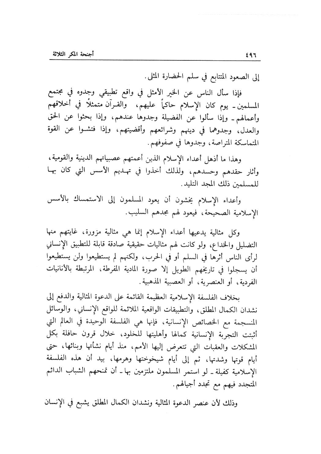 بخلاف الفلسفة الإسلامية العظيمة القائمة على الدعوة المثالية والدفع إلى نشدان الكمال المطلق، والتطبيقات الواقعية الملائمة للواقع الإنساني، والوسائل المنسجمة مع الخصائص الإنسانية، فإنها هي الفلسفة الوحيدة في العالم التي أثبتت التجربة الإنسانية كمالها وأهليتها للخلود، خلال قرون حافلة بكل المشكلات والعقبات التي تتعرض إليها الأمم، منذ أيام نشأتها وبنائها، حتى أيام قوتها وشدتها، ثم إلى أيام شيخوختها وهرمها، بيد أن هذه الفلسفة الإسلامية كفيلة - لو استمر المسلمون ملتزمين بها - أن تمنحهم الشباب الدائم المتجدد فيهم مع تجدد أجيالهم.