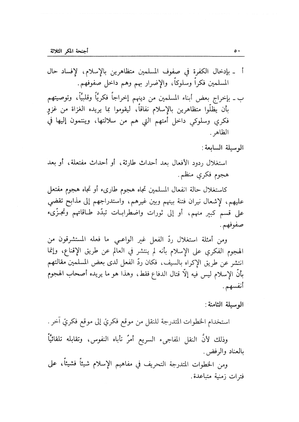 ب- بإخراج بعض أبناء المسلمين من دينهم إخراجاً فكرياً وقلبيّاً، وتوصيتهم بأن يظلّوا متظاهرين بالإسلام نفاقاً، ليقوموا بما يريده الغزاة من غزوٍ فكري وسلوكي داخل أمتهم التي هم من سلالتها، وينتمون إليها في الظاهر.