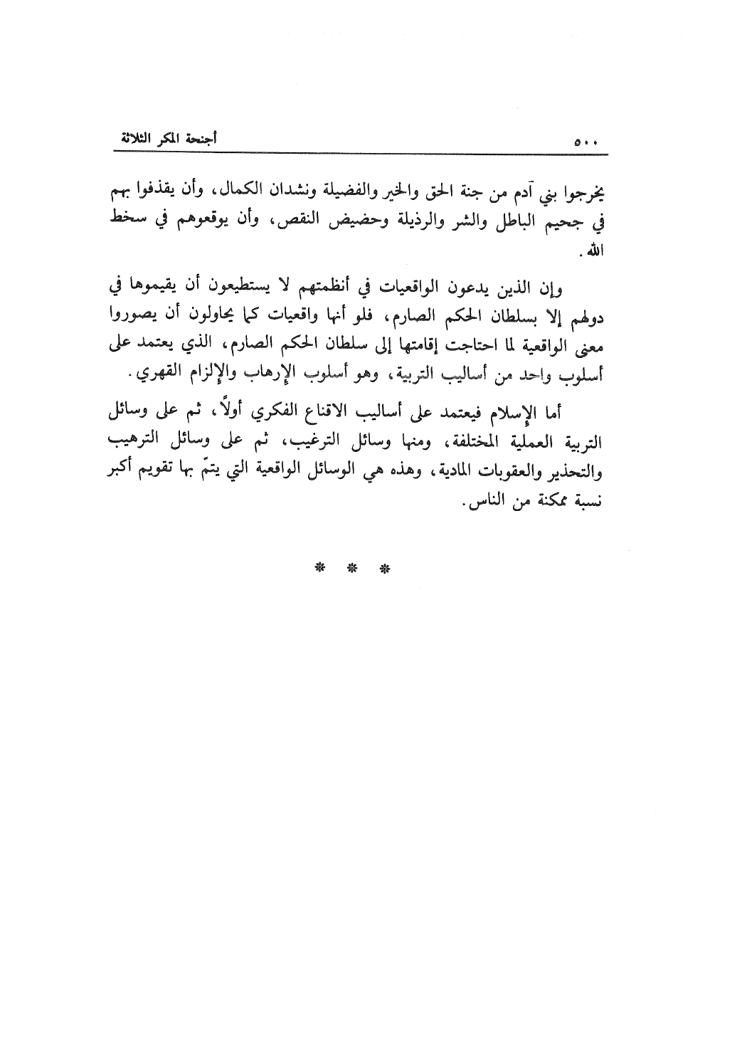 وإن الذين يدعون الواقعيات في أنظمتهم لا يستطيعون أن يقيموها في دولهم إلا بسلطان الحكم الصارم، فلو أنها واقعيات كما يحاولون أن يصوروا معنى الواقعية لما احتاجت إقامتها إلى سلطان الحكم الصارم، الذي يعتمد على أسلوب واحد من أساليب التربية، وهو أسلوب الإرهاب والإلزام القهري.