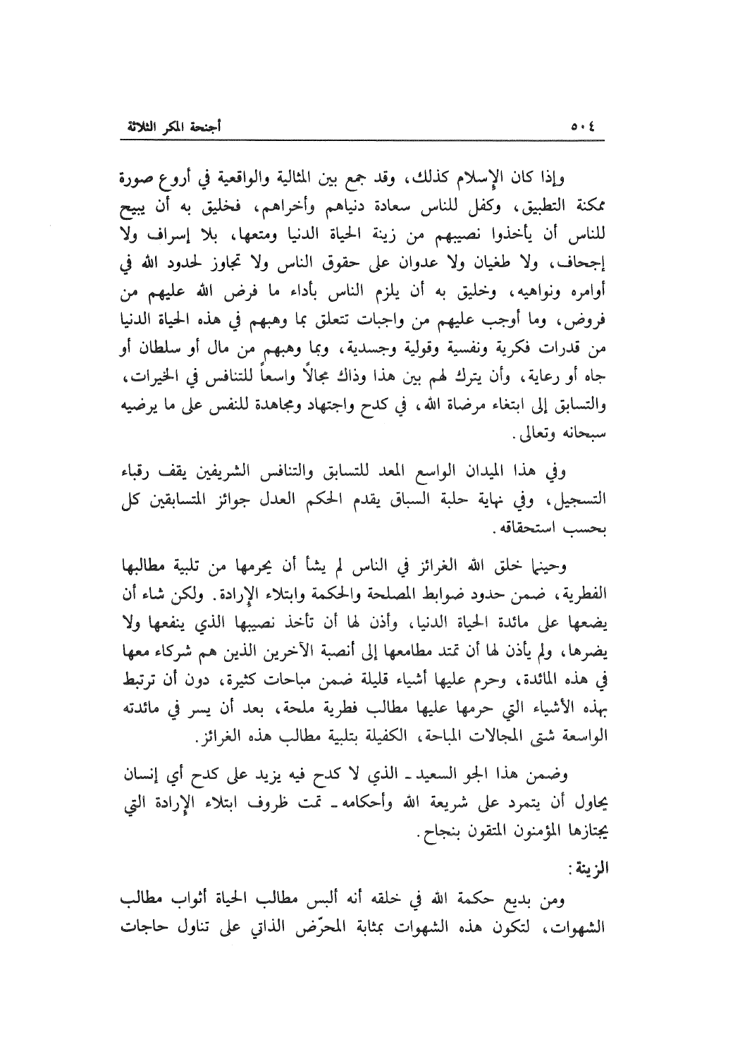 وإذا كان الإسلام كذلك، وقد جمع بين المثالية والواقعية في أروع صورة ممكنة التطبيق، وكفل للناس سعادة دنياهم وأخراهم، فخليق به أن يبيح للناس أن يأخذوا نصيبهم من زينة الحياة الدنيا ومتعها، بلا إسراف ولا إجحاف، ولا طغيان ولا عدوان على حقوق الناس ولا تجاوز لحدود الله في أوامره ونواهيه، وخليق به أن يلزم الناس بأداء ما فرض الله عليهم من فروض، وما أوجب عليهم من واجبات تتعلق بما وهبهم في هذه الحياة الدنيا من قدرات فكرية ونفسية وقولية وجسدية، وبما وهبهم من مال أو سلطان أو جاه أو رعاية، وأن يترك لهم بين هذا وذاك مجالاً واسعاً للتنافس في الخيرات، والتسابق إلى ابتغاء مرضاة الله، في كدح واجتهاد ومجاهدة للنفس على ما يرضيه سبحانه وتعالى.