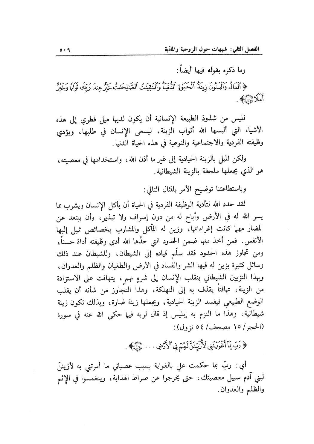 فليس من شذوذ الطبيعة الإنسانية أن يكون لديها ميل فطري إلى هذه الأشياء التي ألبسها الله أثواب الزينة، ليسعى الإنسان في طلبها، ويؤدي وظيفته الفردية والاجتماعية والنوعية في هذه الحياة الدنيا.