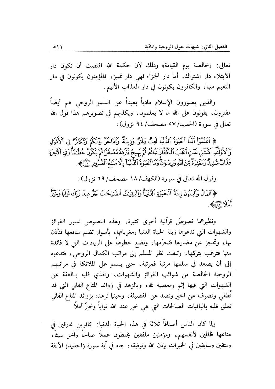 ونظيرهما نصوصٌ قرآنية أخرى كثيرة، وهذه النصوص تسور الغرائز والشهوات التي تدعوها زينة الحياة الدنيا ومغرياتها، بأسوار تضم منافعها فتأذن بها، وتحجز عن مضارها فتحرّمها، وتضع خطوطاً على الزيادات التي لا فائدة منها فترغب بتركها، وتلفت نظر المسلم إلى مراتب الكمال الروحي، فتدعوه إلى أن يصعد في سلمها مرتبة فمرتبة، حتى يسمو على الملائكة في مراتبهم الروحية الخالصة من شوائب الغرائز والشهوات، وتغذي قلبه بالعفة عن الشهوات التي فيها إثم ومعصية لله، وبالزهد في زوائد المتاع الفاني التي قد تُطغي وتصرف عن الخير وتصد عن الفضيلة، وحينما تزهده بزوائد المتاع الفاني تعلق قلبه بالباقيات الصالحات التي هي خير عند الله ثواباً وخيرٌ أملاً.