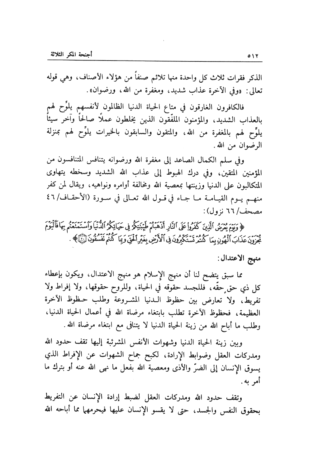 مما سبق يتضح لنا أن منهج الإسلام هو منهج الاعتدال، ويكون بإعطاء كل ذي حقٍ حقّه، فللجسد حقوقه في الحياة، وللروح حقوقها، ولا إفراط ولا تفريط، ولا تعارض بين حظوظ الدنيا المشروعة وطلب حظوظ الآخرة العظيمة، فحظوظ الآخرة تطلب بابتغاء مرضاة الله في أعمال الحياة الدنيا، وطلب ما أباح الله من زينة الحياة الدنيا لا يتنافى مع ابتغاء مرضاة الله.