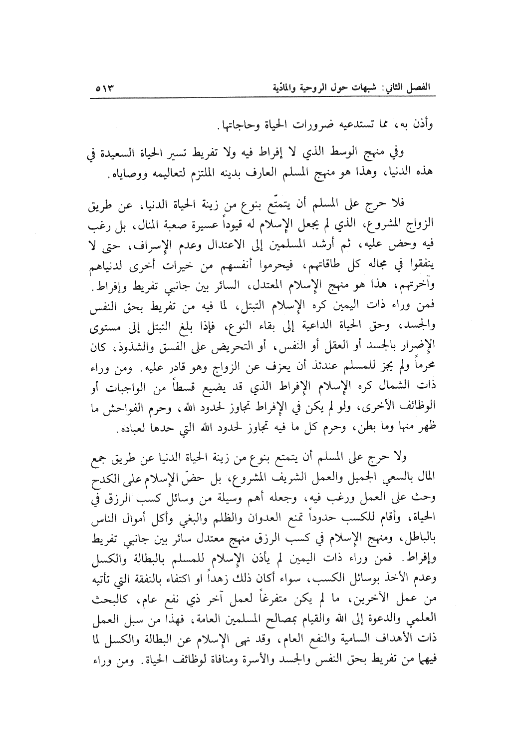 فلا حرج على المسلم أن يتمتّع بنوع من زينة الحياة الدنيا، عن طريق الزواج المشروع، الذي لم يجعل الإسلام له قيوداً عسيرة صعبة الدنيا، بل رغب فيه وحض عليه، ثم أرشد المسلمين إلى الاعتدال وعدم الإسراف، حتى لا ينفقوا في مجاله كل طاقاتهم، فيحرموا أنفسهم من خيرات أخرى لدنياهم وآخرتهم، هذا هو منهج الإسلام المعتدل، السائر بين جانبي تفريط وإفراط. فمن وراء ذات اليمين كره الإسلام التبتل، لما فيه من تفريط بحق النفس والجسد، وحق الحياة الداعية إلى بقاء النوع، فإذا بلغ التبتل إلى مستوى الإضرار الجسد أو العقل أو النفس، أو التحريض على الفسق والشذوذ، كان محرماً ولم يجز للمسلم عندئذ أن يعزف عن الزواج وهو قادر عليه. ومن وراء ذات الشمال كره الإسلام الإفراط الذي قد يضيع قسطاً من الواجبات أو الوظائف الأخرى، ولو لم يكن في الإفراط تجاوز لحدود الله، وحرم الفواحش ما ظهر منها وما بطن، وحرم كل ما فيه تجاوز لحدود الله التي حدها لعباده.