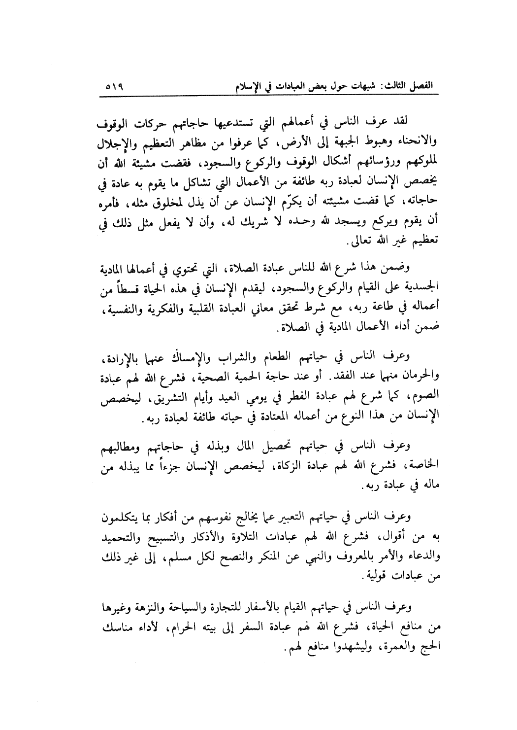 وضمن هذا شرع الله للناس عبادة الصلاة، التي تحتوي في أعمالها المادية الجسدية على القيام والركوع والسجود، ليقدم الإنسان في هذه الحياة قسطاً من أعماله في طاعة ربه، مع شرط تحقق معاني العبادة القلبية والفكرية والنفسية، ضمن أداء الأعمال المادية في الصلاة.