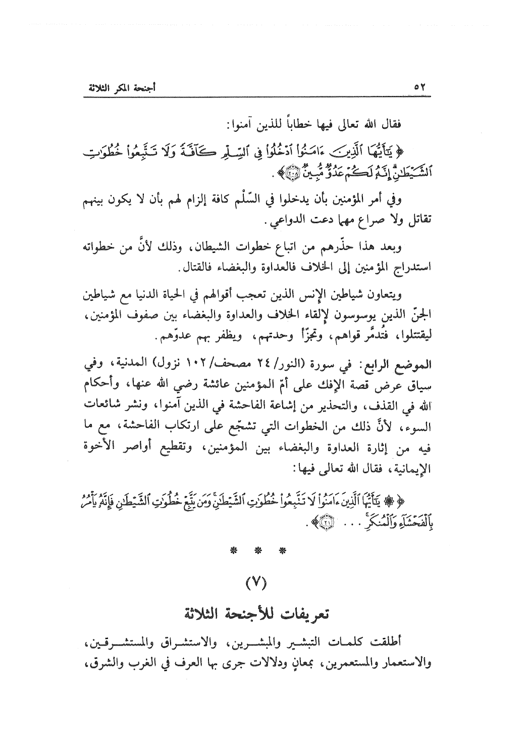 الموضع الرابع: في سورة (النور/24 مصحف/102 نزول) المدنية، وفي سياق عرض قصة الإفك على أم المؤمنين عائشة رضي الله عنها، وأحكام الله في القذف، والتحذير من إشاعة الفاحشة في الذين آمنوا، ونشر شائعات السوء، لأن ذلك من الخطوات التي تشجّع على ارتكاب الفاحشة، مع ما فيه من إثارة العداوة والبغضاء بين المؤمنين، وتقطيع أواصر الأخوة الإيمانية، فقال الله تعالى فيها: