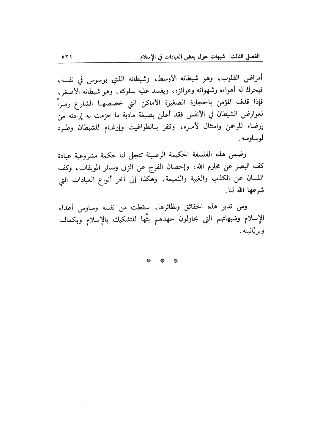 أمراض القلوب، وهو شيطانه الأوسط، وشيطانه الذي يوسوس في نفسه، فيحرك له أهواءه وشهواته وغرائزه، ويفسد عليه سلوكه، وهو شيطانه الأصغر، فإذا قذف المؤمن بالحجارة الصغيرة الأماكن التي خصصها الشارع رمزاً لعوارض الشيطان في الأنفس فقد أعلن بصيغة مادية ما جزمت به إرادته من إرضاء للرحمن وامتثال لأمره، وكفر بالطواغيت وإرغام للشيطان وطرد لوساوسه.