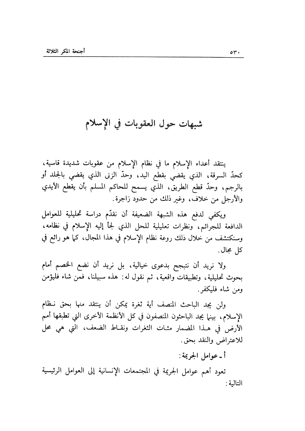 ويكفي لدفع هذه الشبهة الضعيفة أن تقدّم دراسة تحليلية للعوامل الدافعة للجرائم، ونظرات تعليلية للحل الذي لجأ إليه الإسلام في نظامه، وسنكتشف من خلال ذلك روعة نظام الإسلام في هذا المجال، كما هو رائع في كل مجال.
