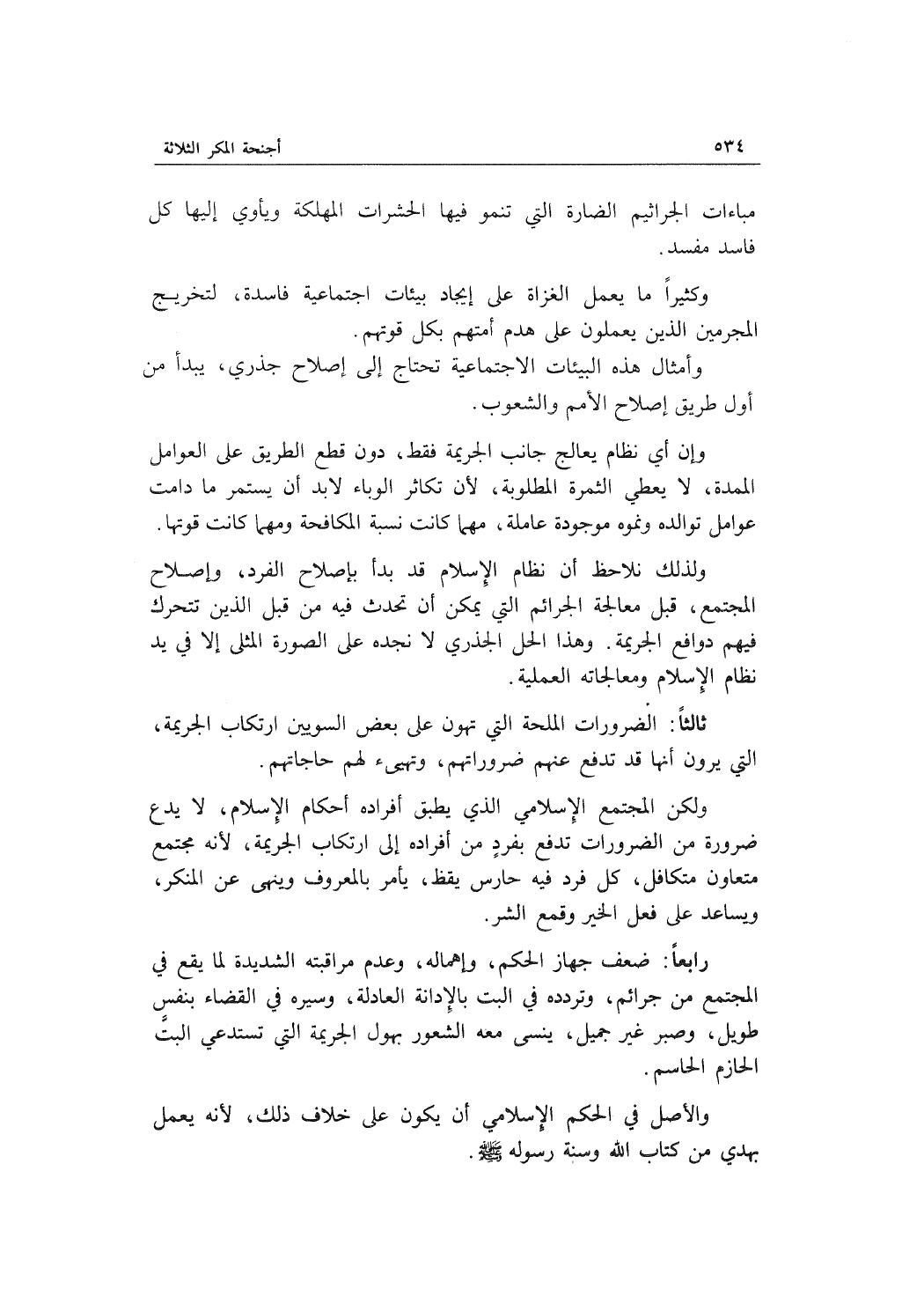 وإن أي نظام يعالج جانب الجريمة فقط، دون قطع الطريق على العوامل الممدة، لا يعطي الثمرة المطلوبة، لأن تكاثر الوباء لا بد أن يستمر ما دامت عوامل توالده ونموه موجودة عاملة، مهما كانت نسبة المكافحة ومهما كانت قوتها.