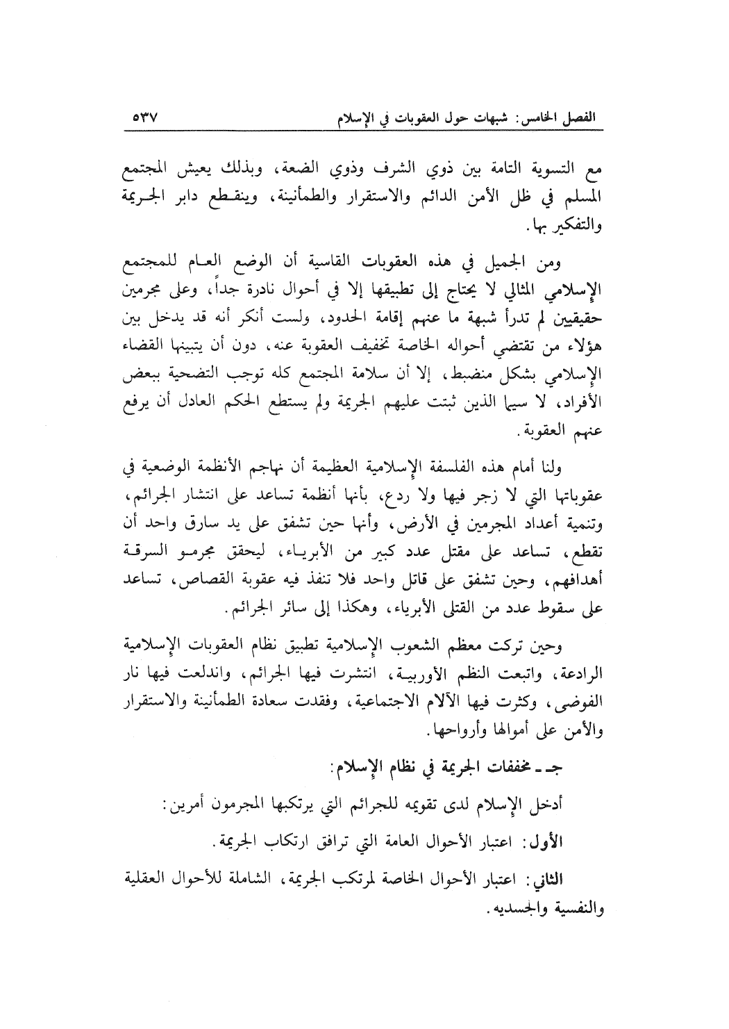 ومن الجميل في هذه العقوبات القاسية أن الوضع العام للمجتمع الإسلامي المثالي لا يحتاج إلى تطبيقها إلا في أحوال نادرة جداً، وعلى مجرمين حقيقيين لم تدرأ شبهة ما عنهم إقامة الحدود، ولست أنكر أنه قد يدخل بين هؤلاء من تقتضي أحواله الخ اصة تخفيف العقوبة عنه، دون أن يتبينها لاقضاء الإسلامي بشكل منضبط، إلا أن سلامة المجتمع كله توجب التضحية ببعض الأفراد، لا سيما الذين ثبتت عليهم الجريمة ولم يستطع الحكم العادل أن يرفع عنهم العقوبة.