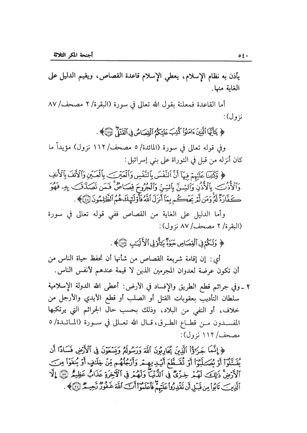 2- وفي جرائم قطع الطريق والإفساد في الأرض: أعطى الله الدولة الإسلامية سلطان التأديب بعقوبات القتل أو الصلب أو قطع الأيدي والأرجل من خلاف، أو النفي من البلاد، وذلك بحسب حال الجرائم التي يرتكبها المفسدون من قطاع الطرق، قال الله تعالى في سورة (المائدة/5 مصحف/112 نزول) :