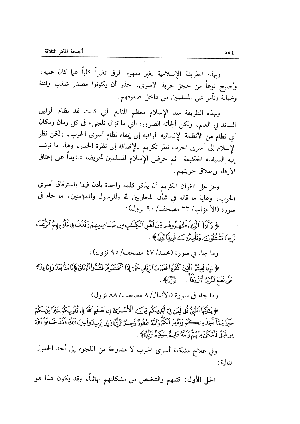 وعز على القرآن الكريم أن يذكر كلمة واحدة يأذن فيها باسترقاق أسرى الحرب، وغاية ما قاله في شأن المحاربن لله وللرسول وللمؤمنين، ما جاء في سورة (الأحزاب/33 مصحف/90 نزول) :