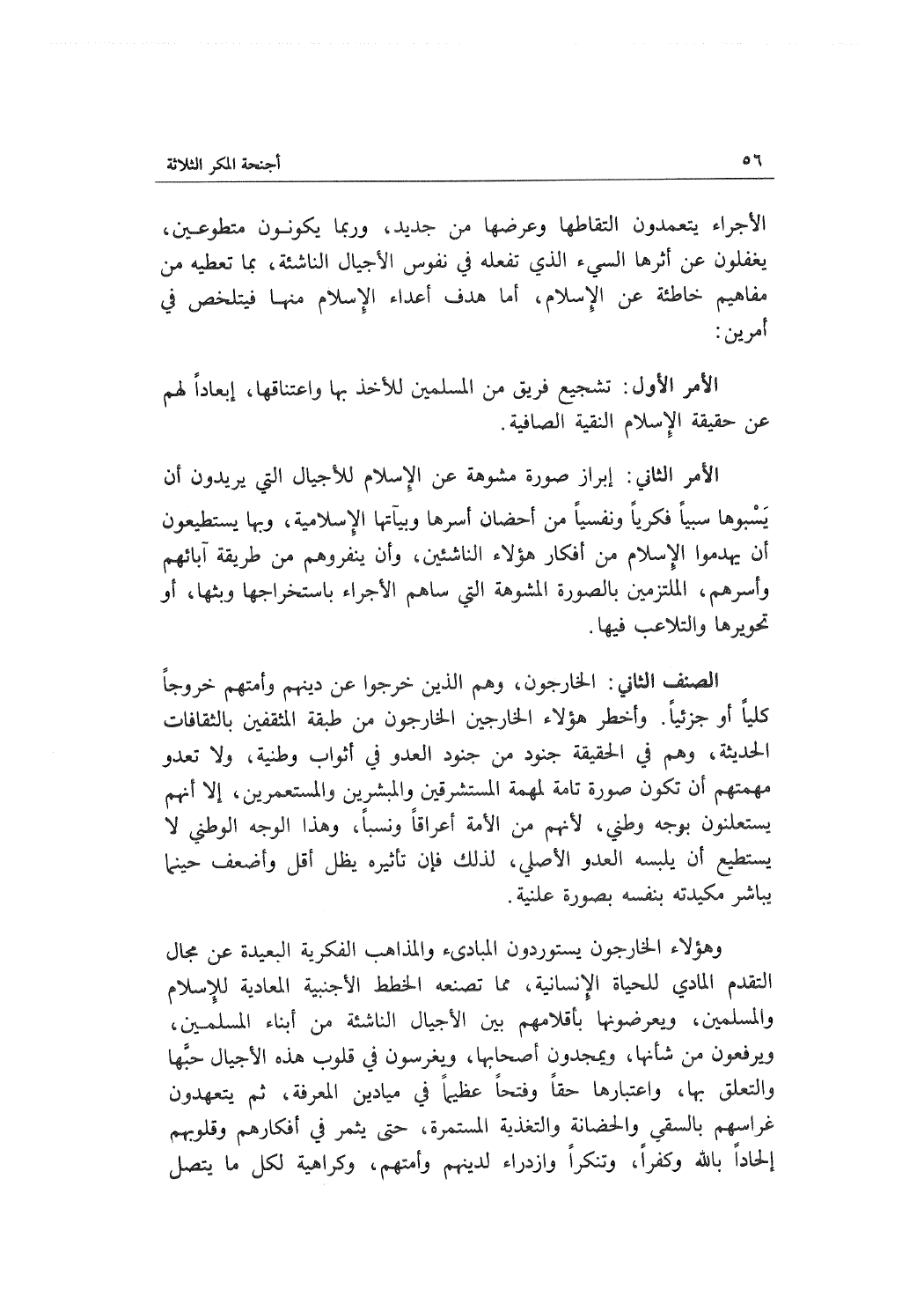 الصنف الثاني: الخارجون. وهم الذين خرجوا عن دينهم وأمتهم خروجاً كلياً أو جزئياً. وأخطر هؤلاء الخارجين الخارجون من طبقة المثقفين بالثقافات الحديثة، وهم في الحقيقة جنود من جنود العدو في أثواب وطنية، ولا تعدو مهمتهم أن تكون صورة تامة لمهمة المستشرقين والمبشرين والمستعمرين، إلا أنهم يستعلنون بوجه وطني، لأنهم من الأمة أعراقاً وأنساباً، وهذا الوجه الوطني لا يستطيع أن يلبسه العدو الأصلي، لذلك فإن تأثيره يظل أقل وأضعف حينما يباشر مكيدته بنفسه بصورة علنية.