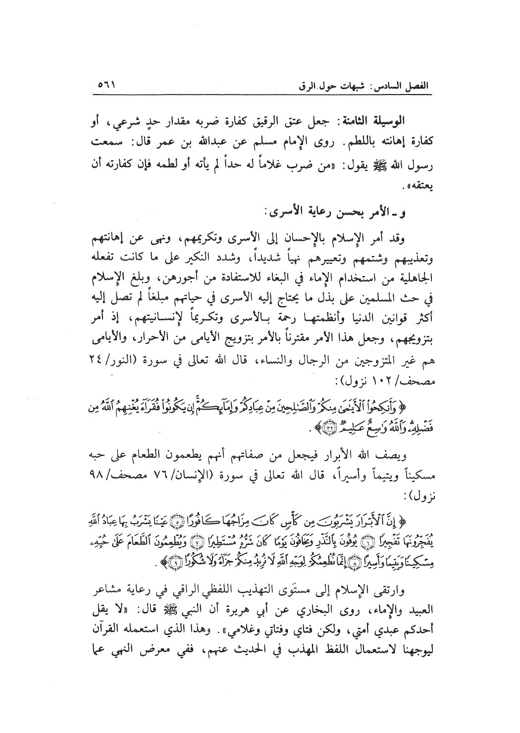 وارتقى الإسلام إلى مستَوى التهذيب اللفظي الراقي في رعاية مشاعر العبيد والإماء، روى البخاري عن أبي هريرة أن النبي قال: "لا يقل أحدكم عبدي أمتي، ولكن فتاي وفتاتي وغلامي". وهذا الذي استعمله القرآن ليوجهنا لاستعمال اللفظ المهذب في الحديث عنهم، ففي معرض النهي عما