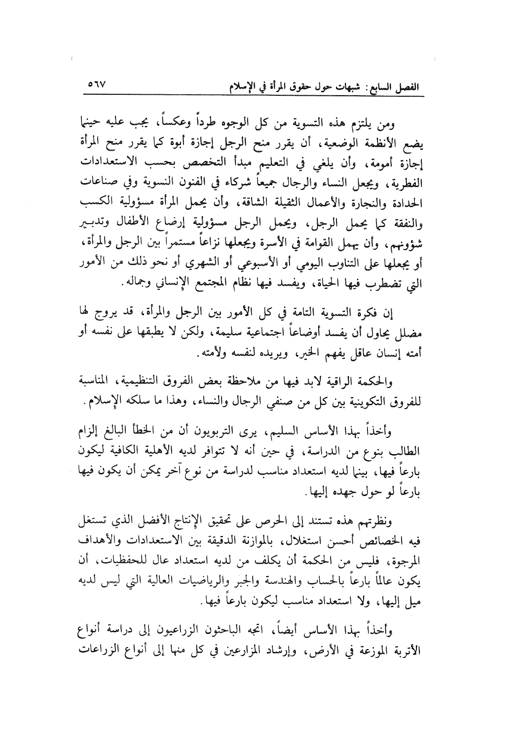 ومن يلتزم هذه التسوية من كل الوجوه طرداً وعكساً، يجب عليه حينما يضع الأنظمة الوضعية، أن يقرر منح الرجل إجازة أبوة كما يقرر منح المرأة إجازة أمومة، وأن يلغي في التعليم مبدأ التخصص بحسب الاستعدادات الفطرية، ويجعل النساء والرجال جميعاً شركاء في الفنون النسوية وفي صناعات الحدادة والنجارة والأعمال الثقيلة الشاقة، وأن يحمل المرأة المسؤولية الكسب والنفقة كما يحمل الرجل، ويحمل الرجل مسؤولية إرضاع الأطفال وتدبير شؤونهم، وأن يهمل القوامة في الأسرة ويجعلها نزاعاً مستمراً بين الرجل والمرأة، أو يجعلها على التناوب اليومي أو الأسبوعي أو الشهري أو نحو ذلك من الأمور التي تضطرب فيها الحياة، ويفسد فيها نظام المجتمع الإنساني وجماله.