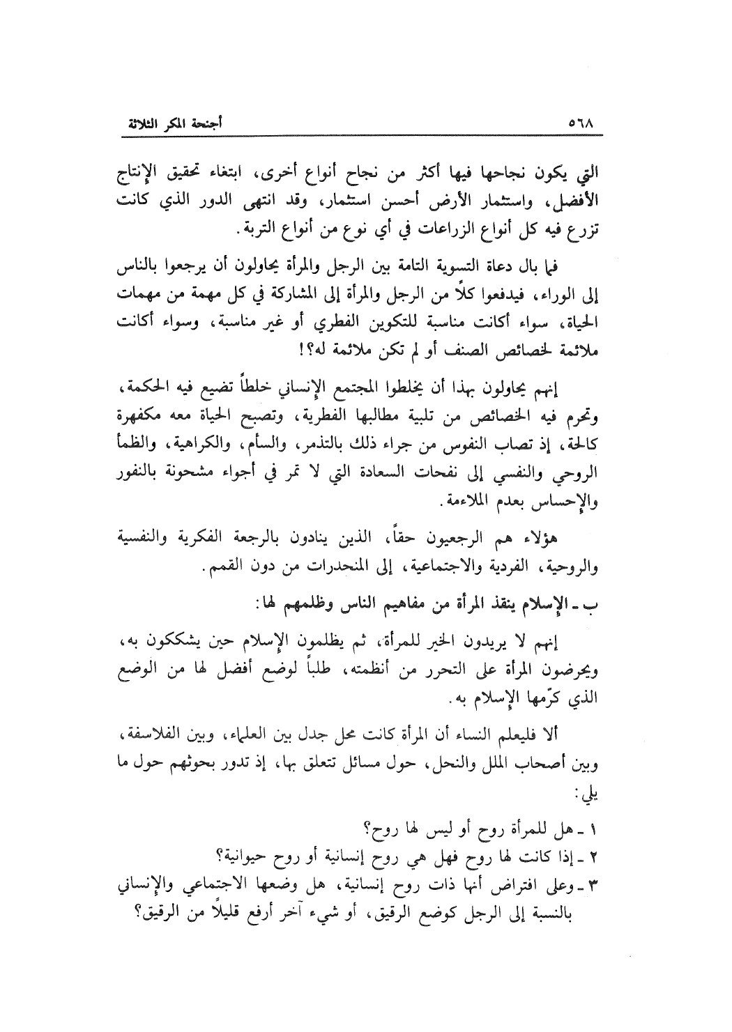 3- وعلى ارتفاض أنها ذات روح إنسانية، هل وضعها الاجتماعي والإنساني بالنسبة إلى الرجل كوضع الرقيق، أو شيء آخر أرفع قليلاً من الرقيق؟